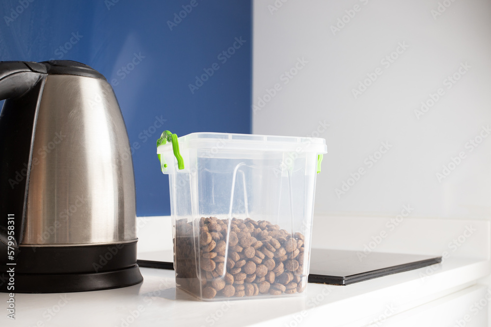 pet food storage, dog feed in a plastic sealed container box with a cap in the home kitchen