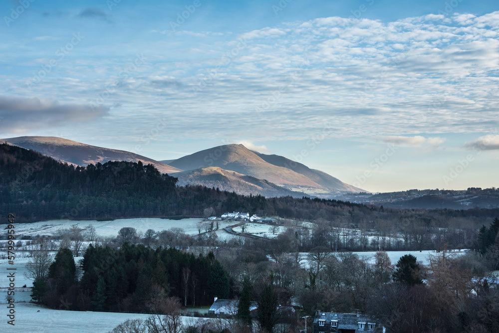 Dramatic beautiful Winter landscape image looking across countryside in Lake District with hard frost on the ground and crisp blue sky