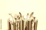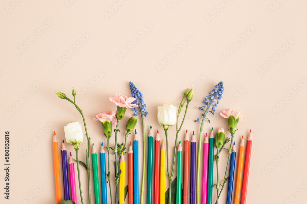 Color pencils with flowers. PANTONE peach fuzz. Color of the 2024 .. Summer school holidays concept. International children’s day background. copy space for text.