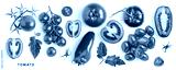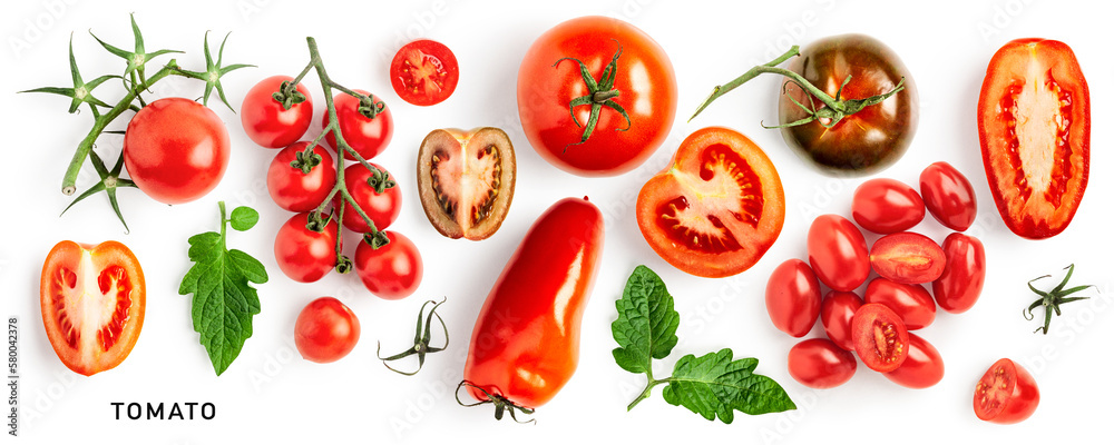 Red tomatoes with leaves set isolated on white background
