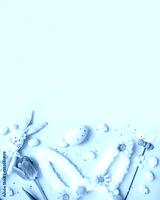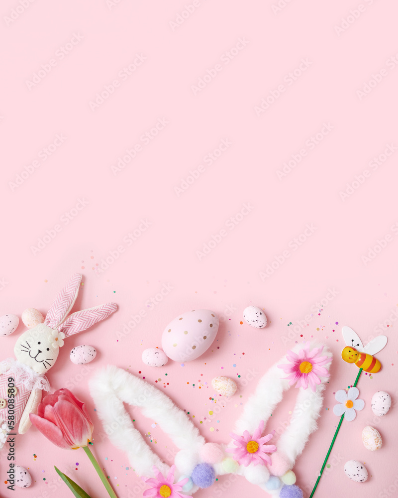 cute easter composition. bunny ears, painted eggs, flowers, confetti and a toy bunny on a pastel pink background. top view. copy space. flat lay. place for text