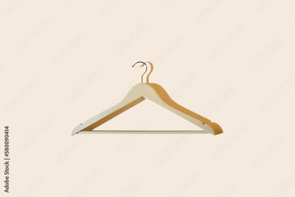 Coat hanger on pastel background with shadows. Space for text. Concept for sale, shop, second hand, online trade, brand resale platform. Banner
