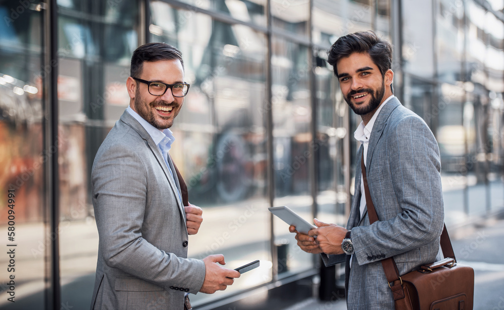 We are successful team. Business people in front of the corporation. Business, lifestyle concept