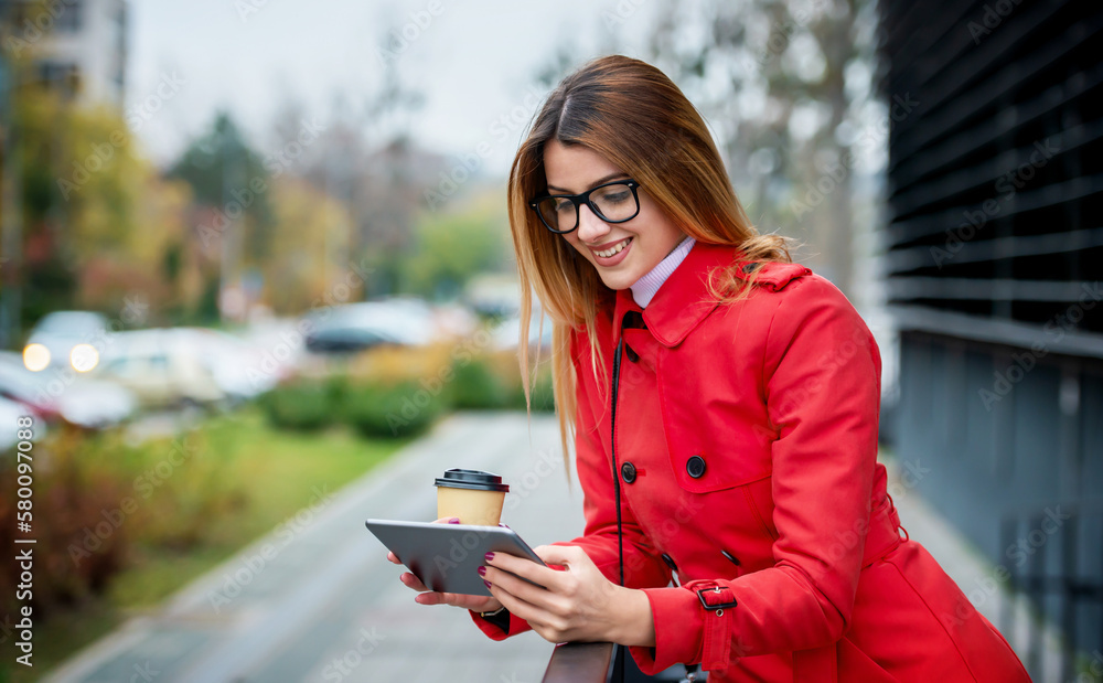 Businesswoman drinking coffee and searching internet with tablet in front of the office. Business, lifestyle concept