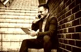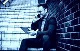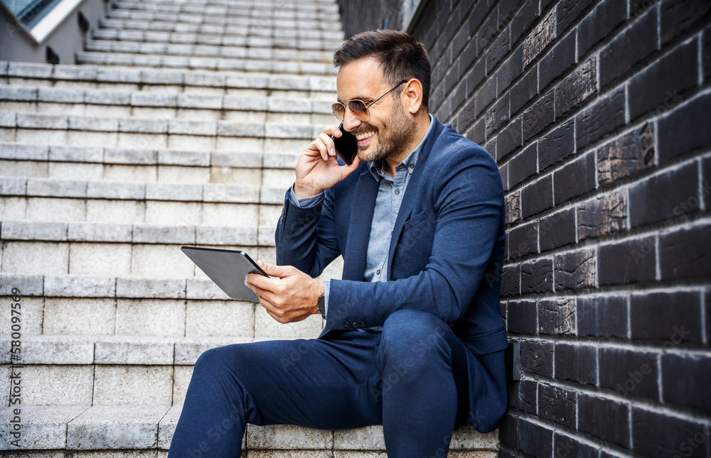 Business people. Businessman holding tablet and making a phone call in front of the corporation. Business, lifestyle concept