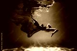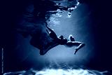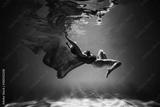 Art work. A slender, tanned girl with an athletic figure and blond hair, with red material and light underwear, in a ballet pose underwater in the pool. Aesthetic image for your design or decoration.