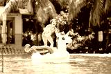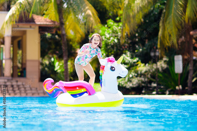 Child on unicorn float in swimming pool. Kids swim