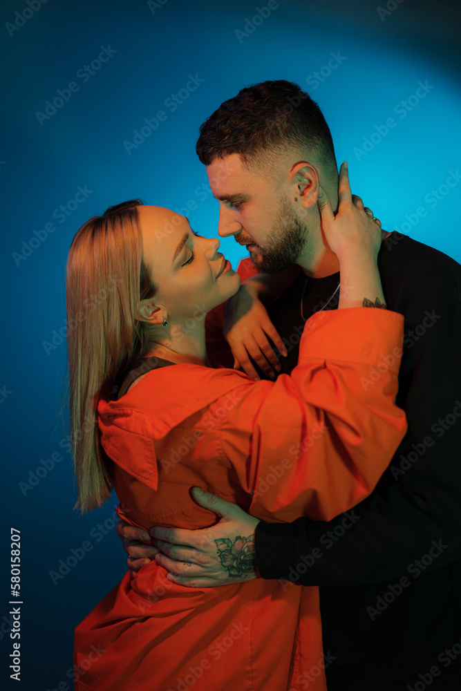 Side view of young man and woman in casual clothes touching each other while standing in dark room with blue neon illumination
