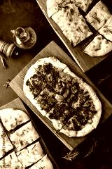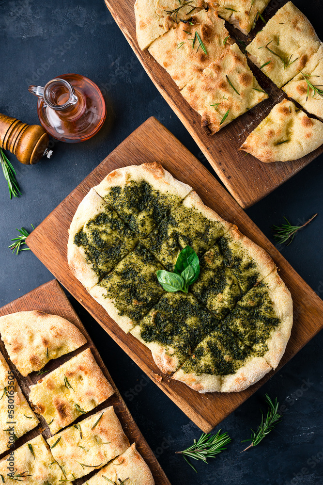 Set of fresh crispy pinsa with rosemary and basil in wooden board.