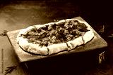 Sweet dessert pizza or pinsa with chocolate sauce, pistachios, powdered sugar and mint.