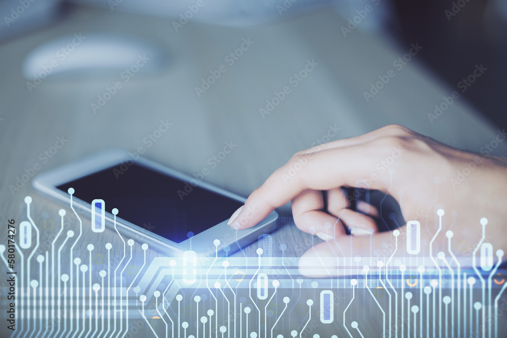 Double exposure of technology sketch hologram and woman holding and using a mobile device.