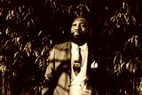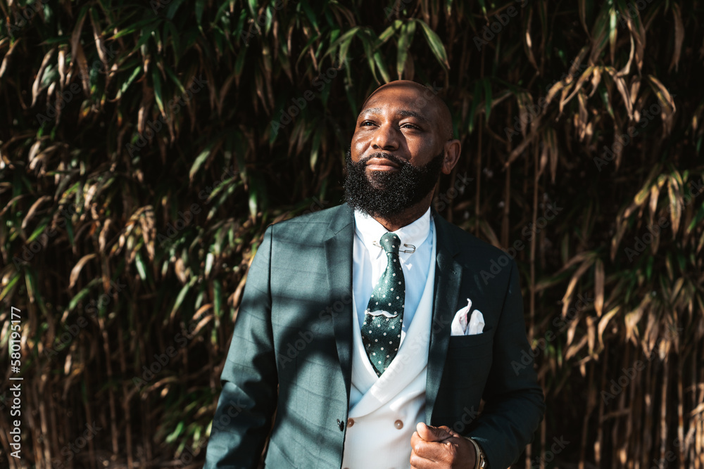 A portrait of a confident black businessman, dressed in a tailored suit, a white vest, a playful polka dot tie, and a white neckerchief. In the background a natural green yellow leafy scene
