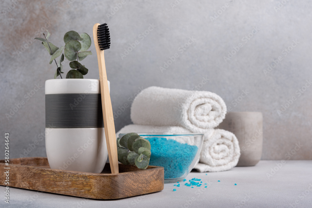 Eco friendly bathroom concept. Bamboo toothbrush in a glass with sea salt