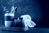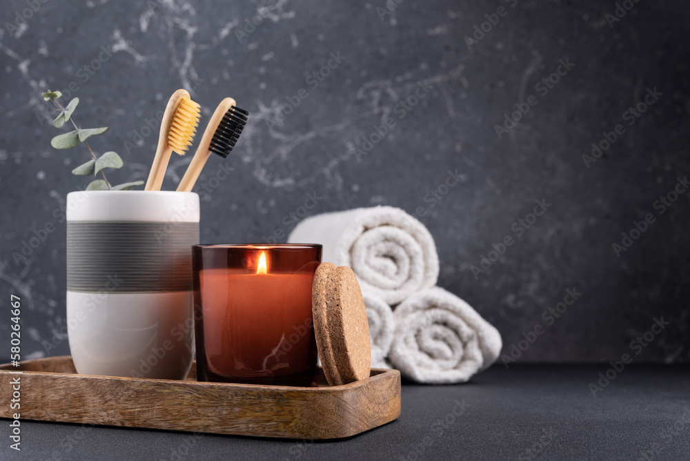 Eco friendly bathroom concept. Bamboo toothbrush in a glass with candle and towels