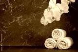 Background with towels and orchid for natural, eco friendly, beauty, bathroom or treatment product