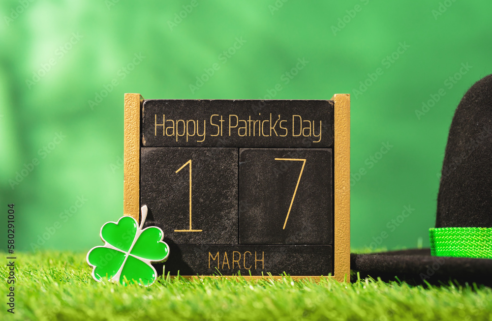 Happy St Patricks Day text calendar with shamrock and leprechaun hat. Four leaf clover. Party hat in vibrant green color. Save the date 17 March