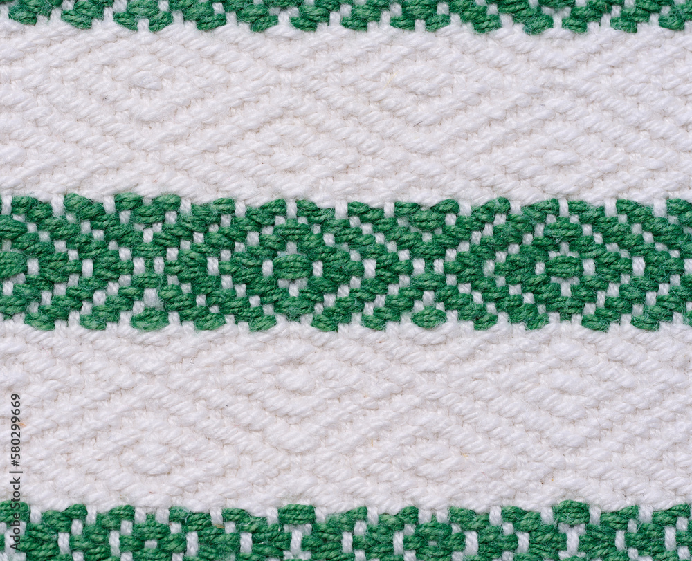 Piece of cotton fabric for making tablecloths and kitchen towels with green embroidered elements