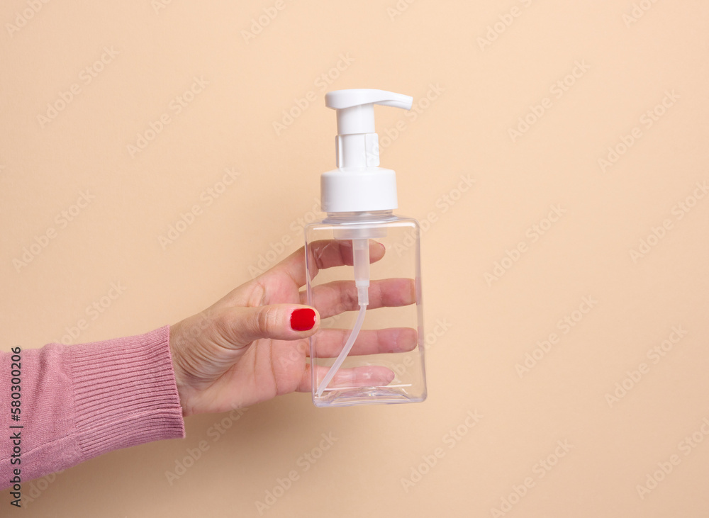 Female hand holds empty plastic container with dispenser for liquid products, soap or shampoo on beige background