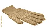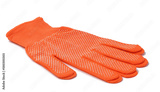 Orange textile work gloves on a white background. Protective clothing for manual workers, top view