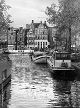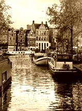 Amsterdam Netherlands, Holland. Dancing houses over river Amstel landmark in old european city fall landscape. House boats on the water. Autumn evening street