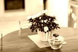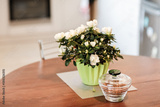 White rose bouquet in green pot on table as home decor