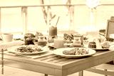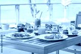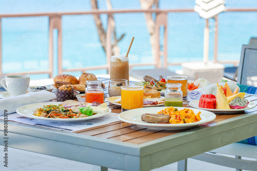 Breakfast in tropical hotel with sea view. Buffet food in restaurant in modern resort. Concept of travel and summer vacation.