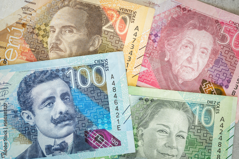 Peru currency, Peruvian soles money, various banknotes, financial and business concept