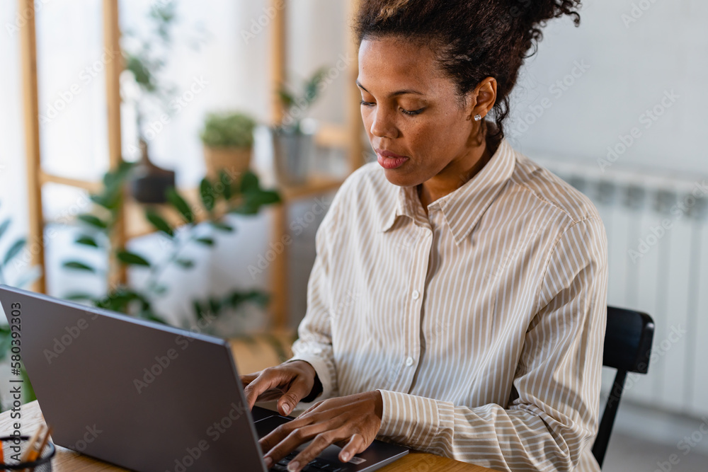 Young African Ethnicity Freelancer Woman Working On Laptop At Home Office, Sitting At Desk Near Window, Looking At Screen, Enjoying Remote Work