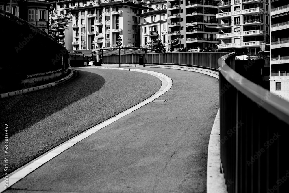 Abstract wavy asphalt streets with white lines and residential flat houses in the background of a french city