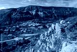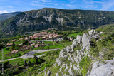 Small French country village in valley between rocky mountains and lush green fields