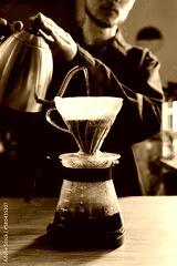 Pour over filter coffee alternative brewing method. Barista is pouring hot water over roasted and ground coffee beans contained in paper filter.