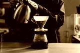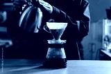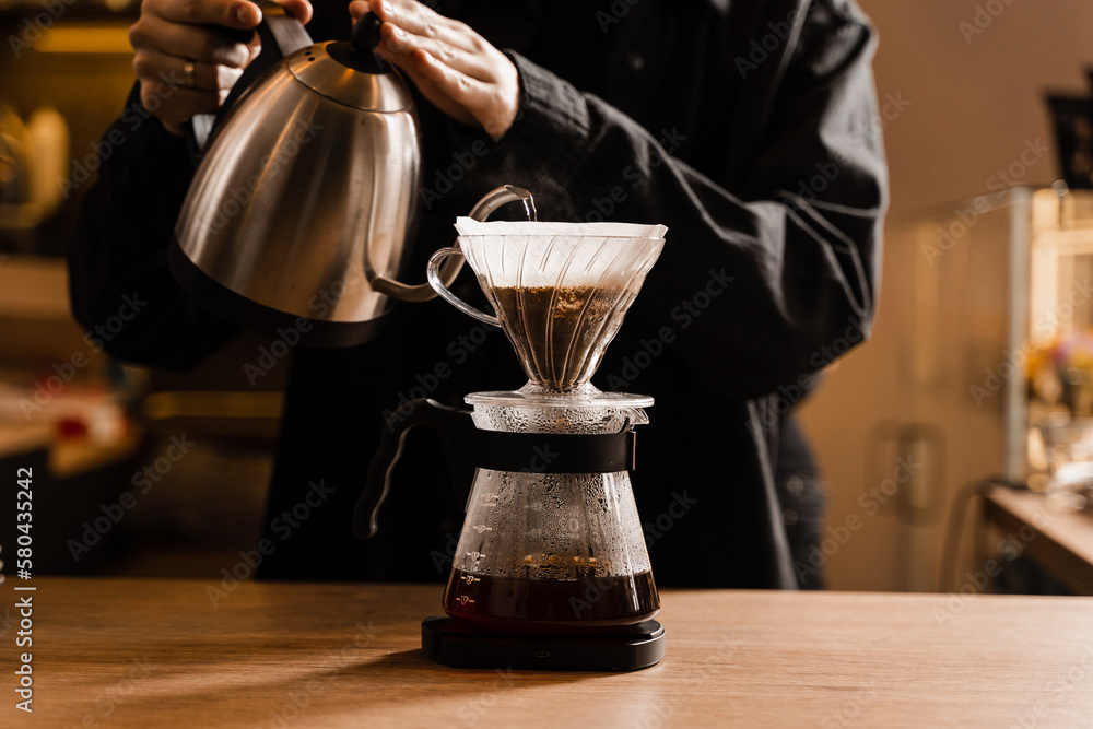Drip filter coffee brewing. Barista pouring hot water over filter with ground coffee in the funnel. Pour over alternative method of pouring water over ground coffee beans contained in filter.