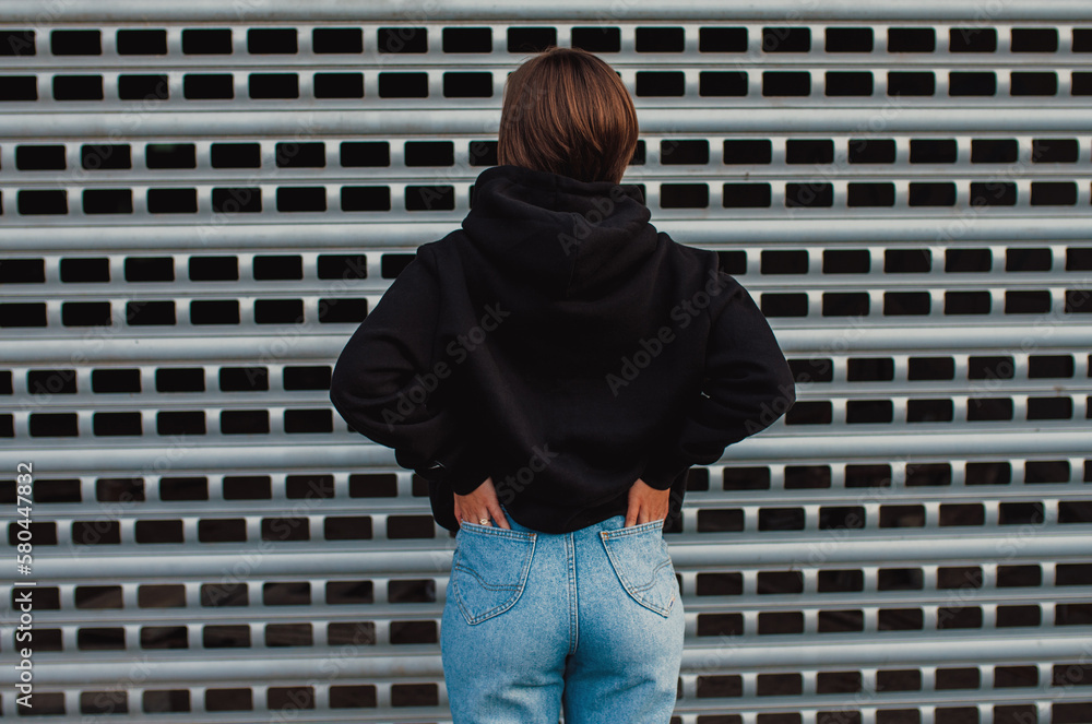 Handsome young female wearing black blank hoodie with space for your logo or design. Mockup for print