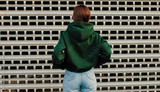 Handsome young female wearing green (watercolor) blank hoodie with space for your logo or design. Mockup for print