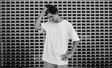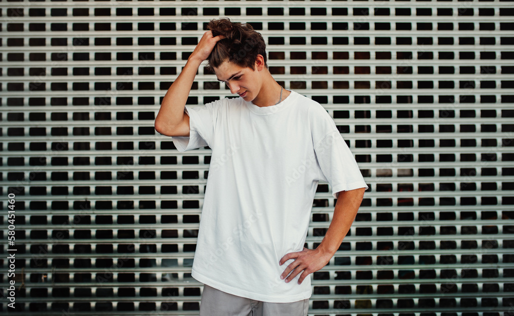 Young handsome hipster guy wearing white blank t-shirt . Mock-up for print. T-shirt template.