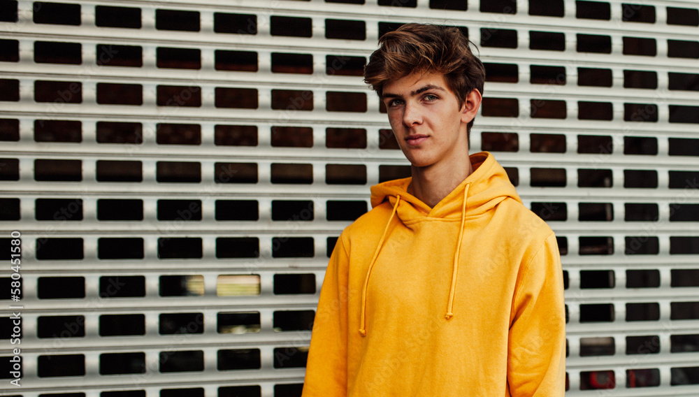 City portrait of handsome young guy wearing yellow blank hoodie or sweatshirt with space for your logo or design. Mockup for print