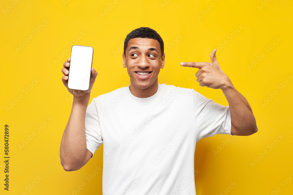 young african american guy in white t-shirt shows blank screen of smartphone on yellow isolated background