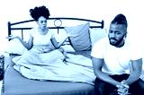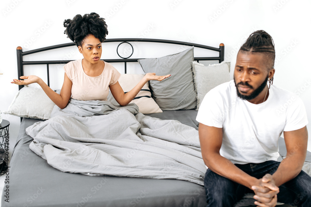 Quarrel, disagreement, jealousy. An African American married couple sort things out at home in the bedroom, a woman yells at a man, accuses him. Misunderstanding in relationships, dispute