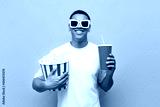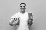young african american guy in 3d glasses watches movie and holds popcorn and soda on yellow isolated background