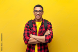 young guy african american student in glasses with backpack on yellow isolated background, student latino in shirt
