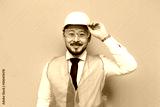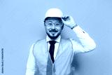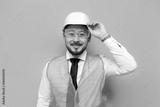 asian builder engineer in uniform on yellow isolated background, male korean man in hard hat and work vest