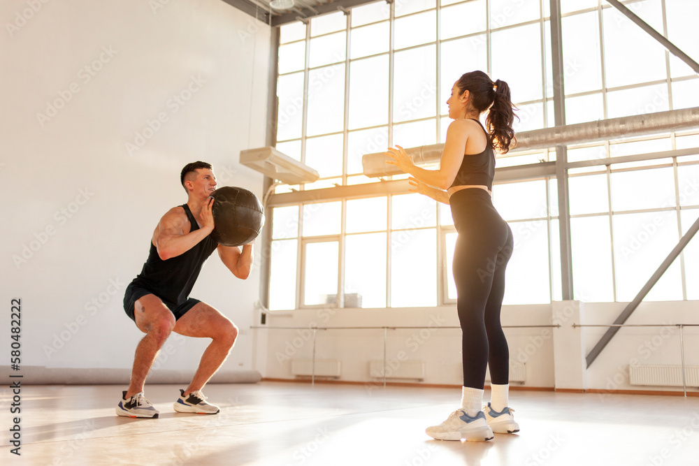 athletic couple in sportswear at crossfit training throw the ball in the room, woman and man together at fitness