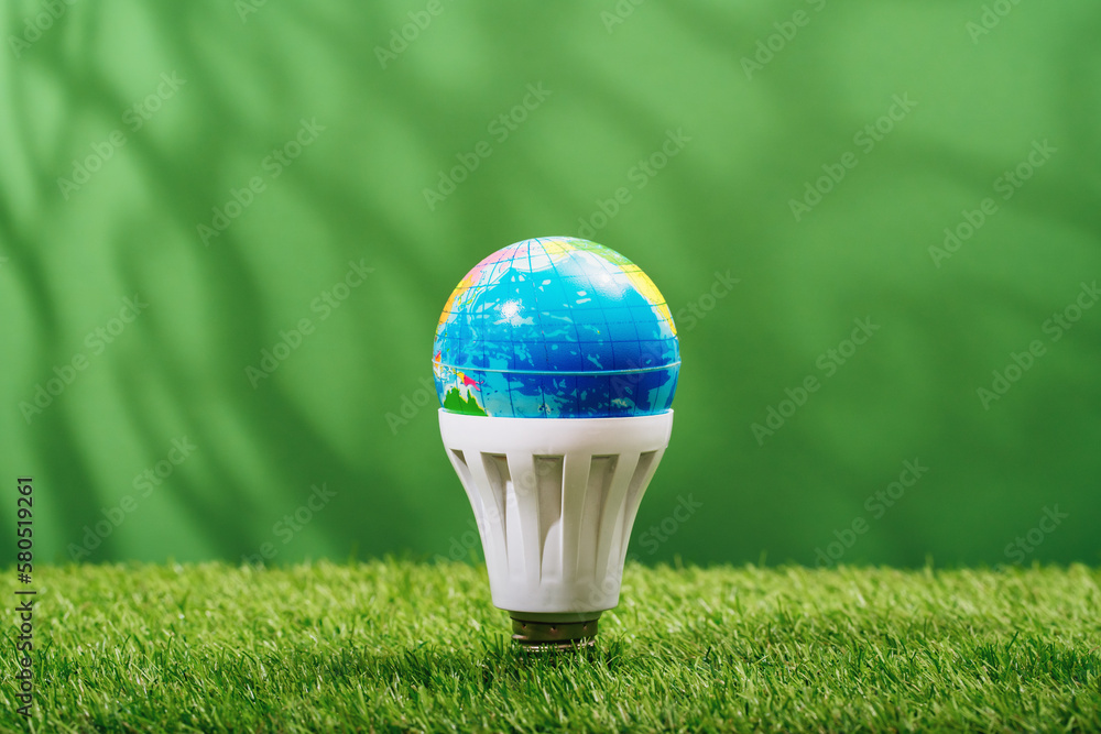 Globe in LED light bulb in green grass ecological background. ESG Green energy efficient saving and innovative smart house solutions. Sustainable consumption and lifestyle. Earth Day