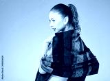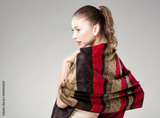 beautiful woman wearing colorful kashmir scarf isolated on grey