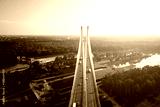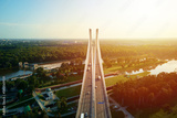 Aerial drone view of Redzinski bridge over Odra river in Wroclaw city, Poland. Large cable stayed bridge with car traffic in european city, bird eye view. Transportation infrastructure and logistic