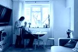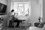 Same Sex Male Couple In Lounge Sitting At Table With Laptop Working From Home Together