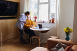 Loving Same Sex Male Couple In Lounge Sitting At Home Looking At Laptop Together Shopping Or Booking Kissing