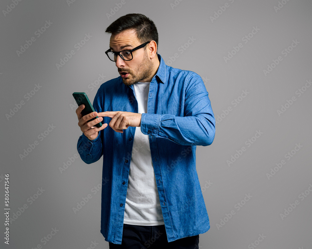 Shocked mid adult man wearing denim shirt and eyeglasses reading bad news while texting over smart phone isolated against gray background