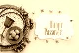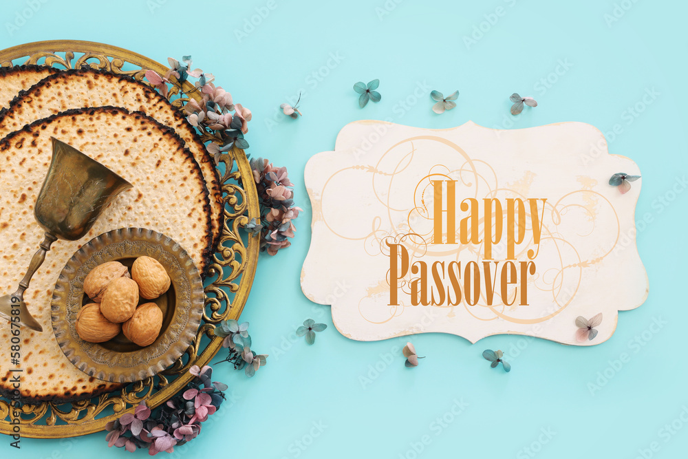 Pesah celebration concept (jewish Passover holiday) over pastel blue background