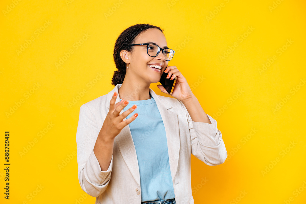 Positive excited successful busy mixed race woman, talking on mobile phone with friend or colleague, looking away, gesturing with hand, smiling, standing on isolated yellow background